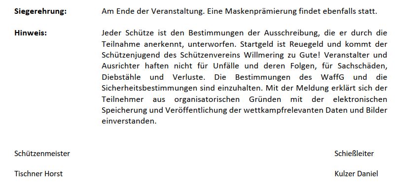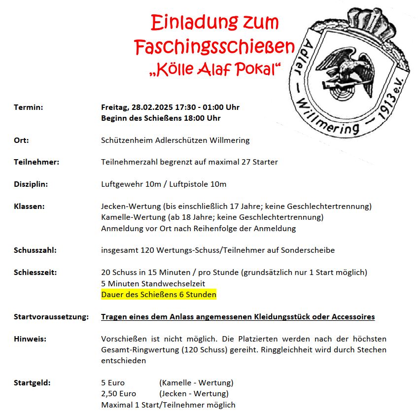 6-Stunden-Schießen "Kölle Alaaf" 6-Stunden-Schießen "Kölle Alaaf" 28. Februar 2025 - 17:30 Willmering Hochwertige Sachpreise und Möglichkeit zum König- und Lieslschiessen