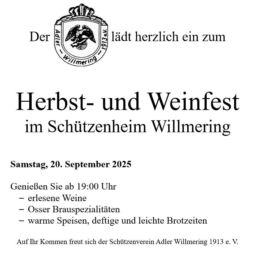 Traditionelles Herbst- und Weinfest Traditionelles Herbst- und Weinfest 20. September 2025 - 19:00 Willmering